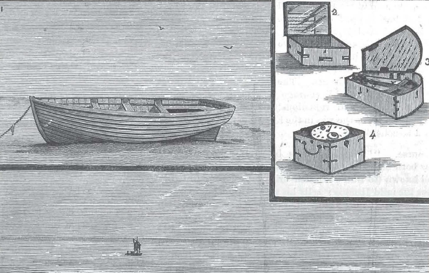 Water was pouring into the Mignonette. Stephens, Brooks, and Parker were yelling from the lifeboat as Dudley came up on deck. He tossed the compass into the lifeboat and threw the sextant and chronometer into the water nearby, mindful not to damage the floor planks of the lifeboat by throwing the heavy gear right in. He tried to toss the food tins into the dinghy, but only one made it. With the Mignonette sinking fast, Dudley finally dropped into the lifeboat. The men hustled to pull their crucial supplies out of the water. They grabbed the sextant and the chronometer, bobbing nearby in their wooden cases, and they managed to retrieve one more of the food tins. The other four were lost in the roiling ocean. They found the wooden stand that went with the breaker of water Parker had thrown from the yacht, but they could not find the cask itself. They searched for the precious drinking water, but they never found it.