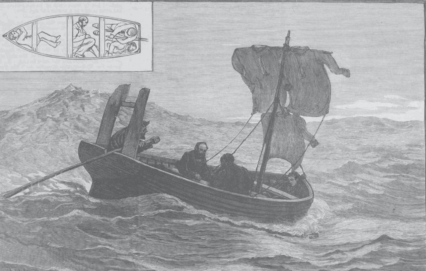 For the next five minutes, there was “nothing but confusion,” Stephens later recalled. The men were desperate to escape in the lifeboat, but they had just lashed it down tightly to keep it from washing overboard. While Stephens fought to steer the foundering yacht, the other three men surrounded the dinghy and struggled to get it loose. Dudley was still holding the small axe he had been using to hammer tacks. He used the blade to hack at the cords holding down the stern of the lifeboat, then passed it to Brooks, who cut the cords on the bow. While the Mignonette continued to fill with water, the men lowered the dinghy into the sea.